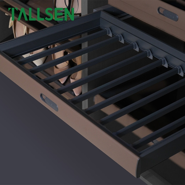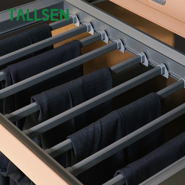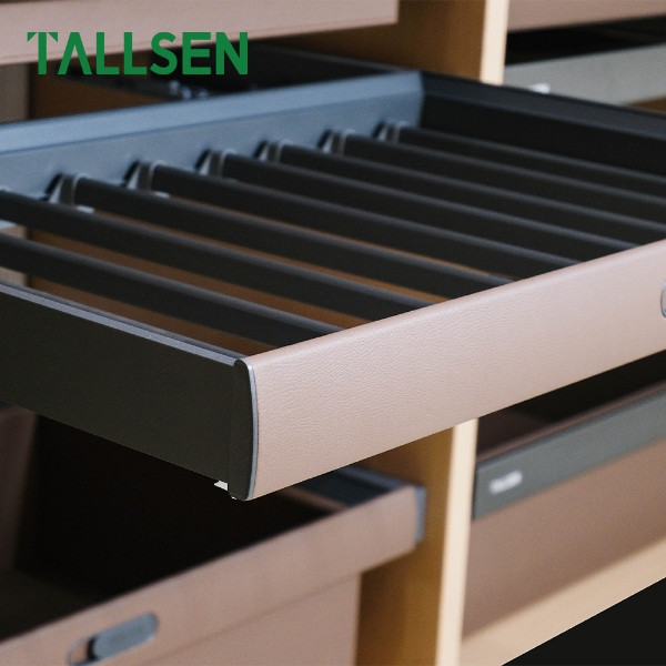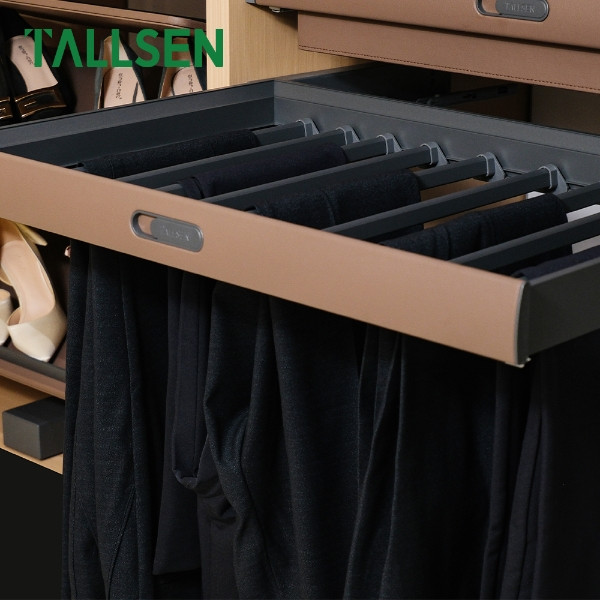Maintain the neatness and organization of your trousers in your wardrobes with this Luxury Trousers Rack. This rack combines a strong Aluminium Alloy frame with a mounting base constructed from genuine Leather and MDF, ensuring stability and a sophisticated look. The rack features an integrated design with Soft Close Undermount Drawer Slides, providing smooth and quiet pull-out and closing action that prevents shelf slamming. The standard dimensions (564 * 465 * 80mm) and the Earth Brown color make it a perfect addition to luxury wardrobe accessories.