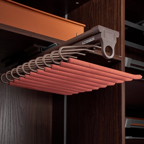 - وصول سلس بسحاب علوي: يتميز بنظام سحاب (آلية سحب) مثبت في الجزء العلوي، مما يتيح لك سحب الإكسسوار بسلاسة إلى الخارج لتعليق البناطيل أو اختيارها، ثم إعادته إلى مكانه داخل الدولاب بكل يسر، محافظًا على المظهر المنظم.